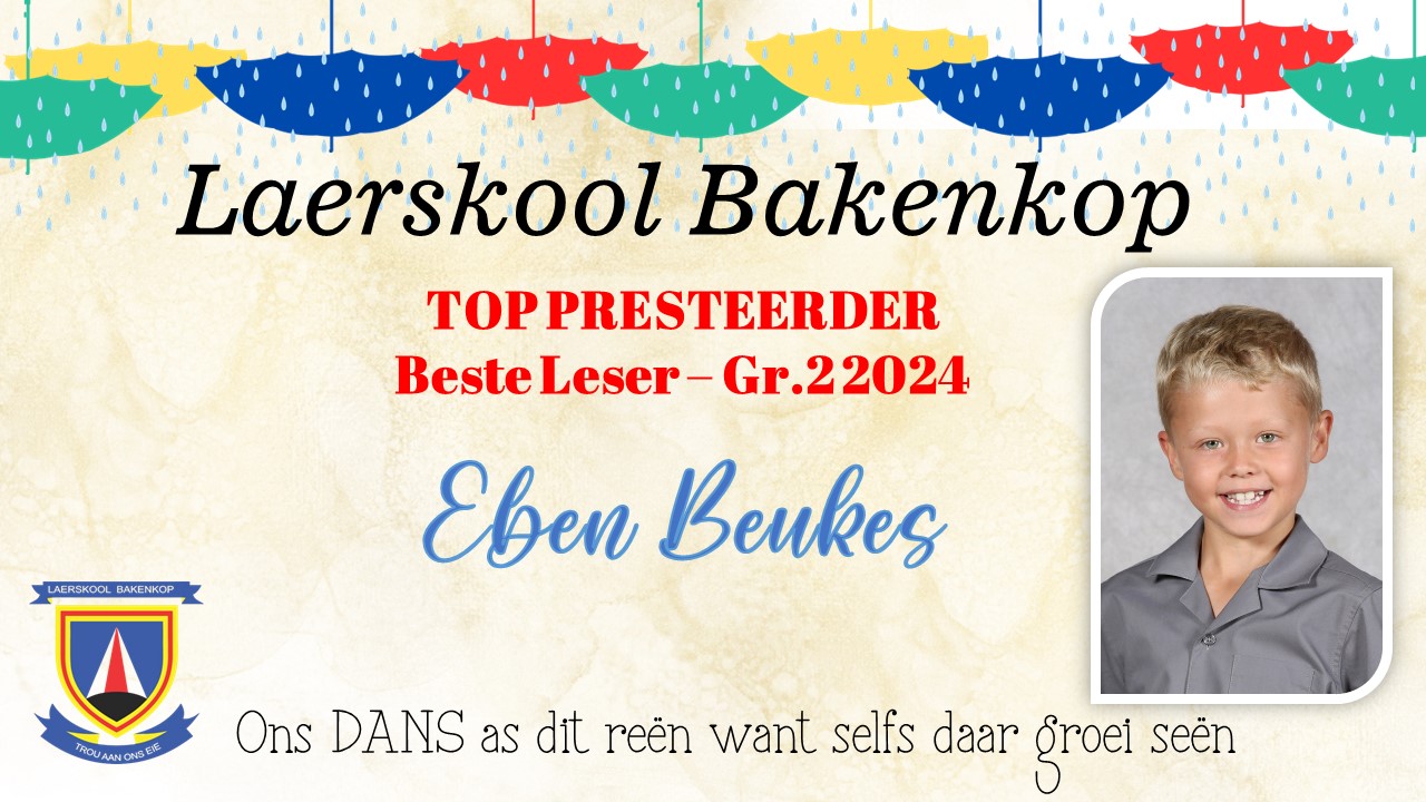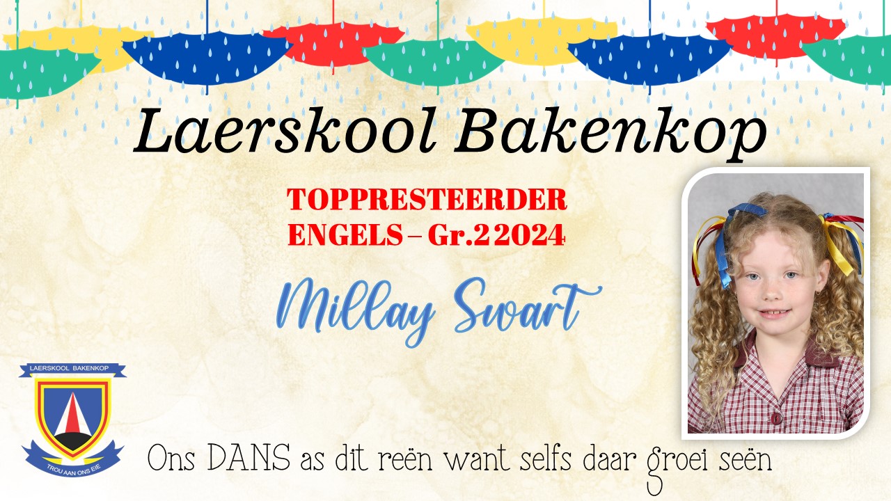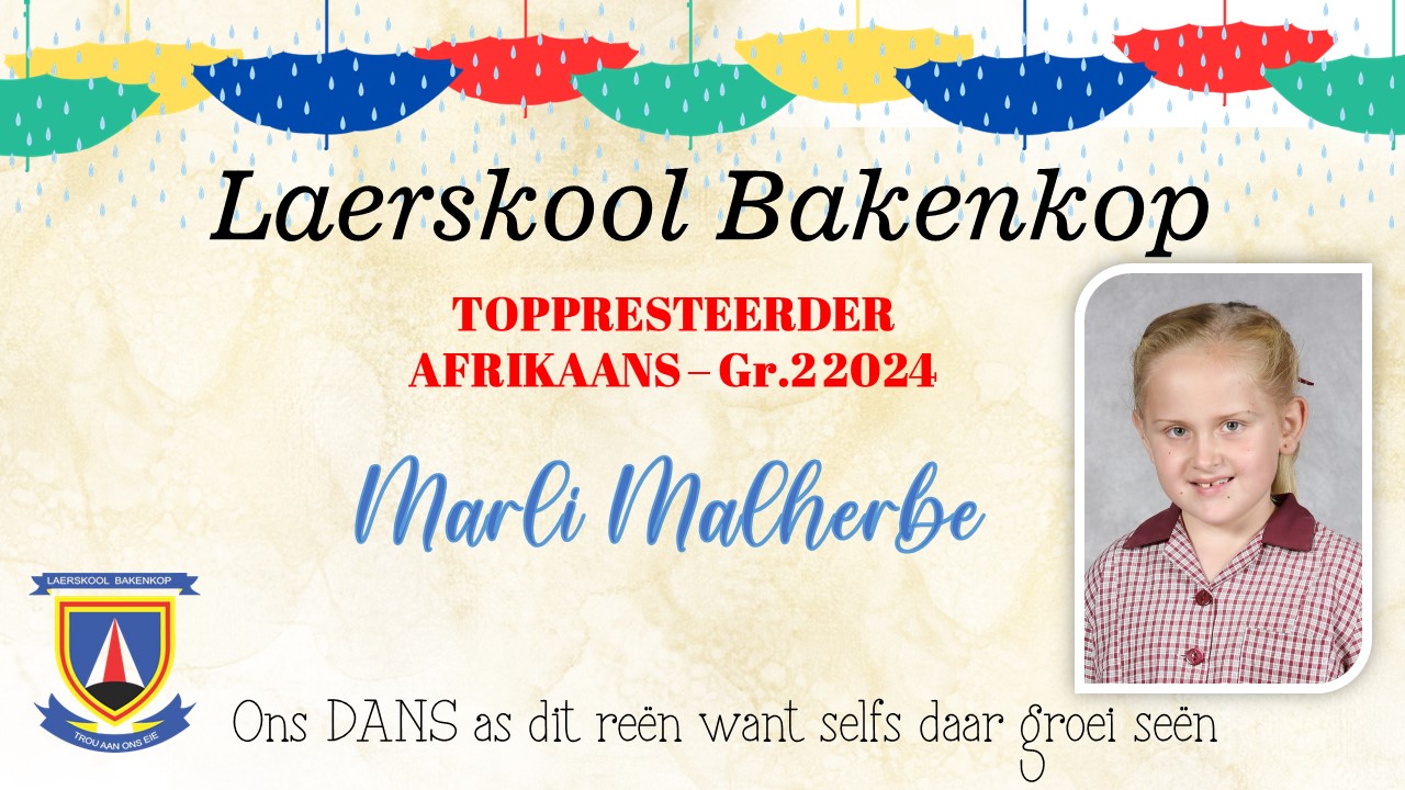 Baie geluk aan die Gr. 2 leerders wat op Akademiesegebied 'n sertifikaat en/of trofee ontvang het vir jou harde werk tydens ons Akademiese prysuitdelingsaand in 2024. Hieronder is ons uitsonderlike presteerders wat trofees ontvang het vir Akademie. Die toppresteerders vir sport en kultuur is onder die afsonderlike afdelings.