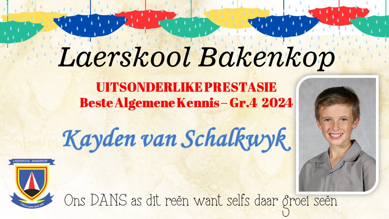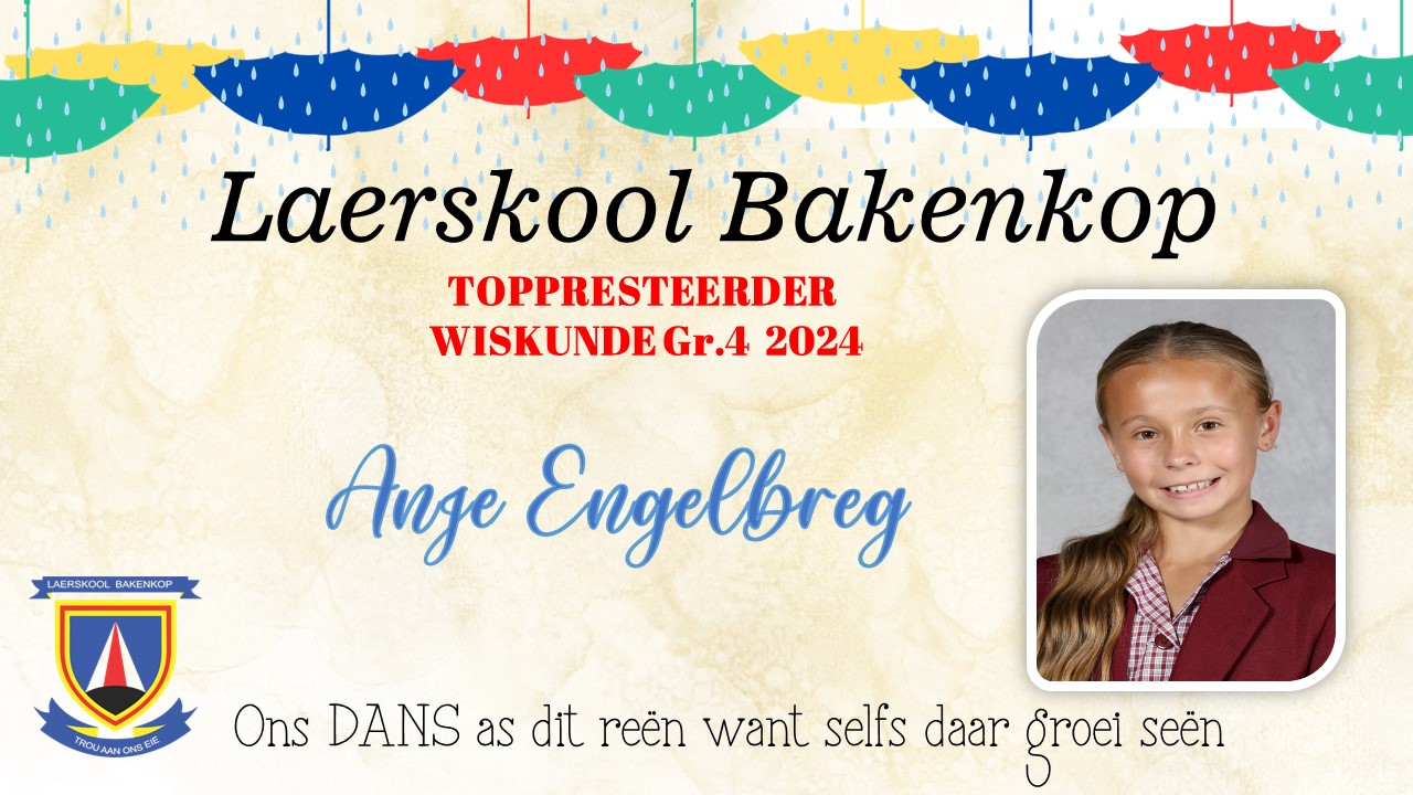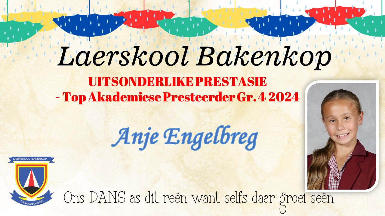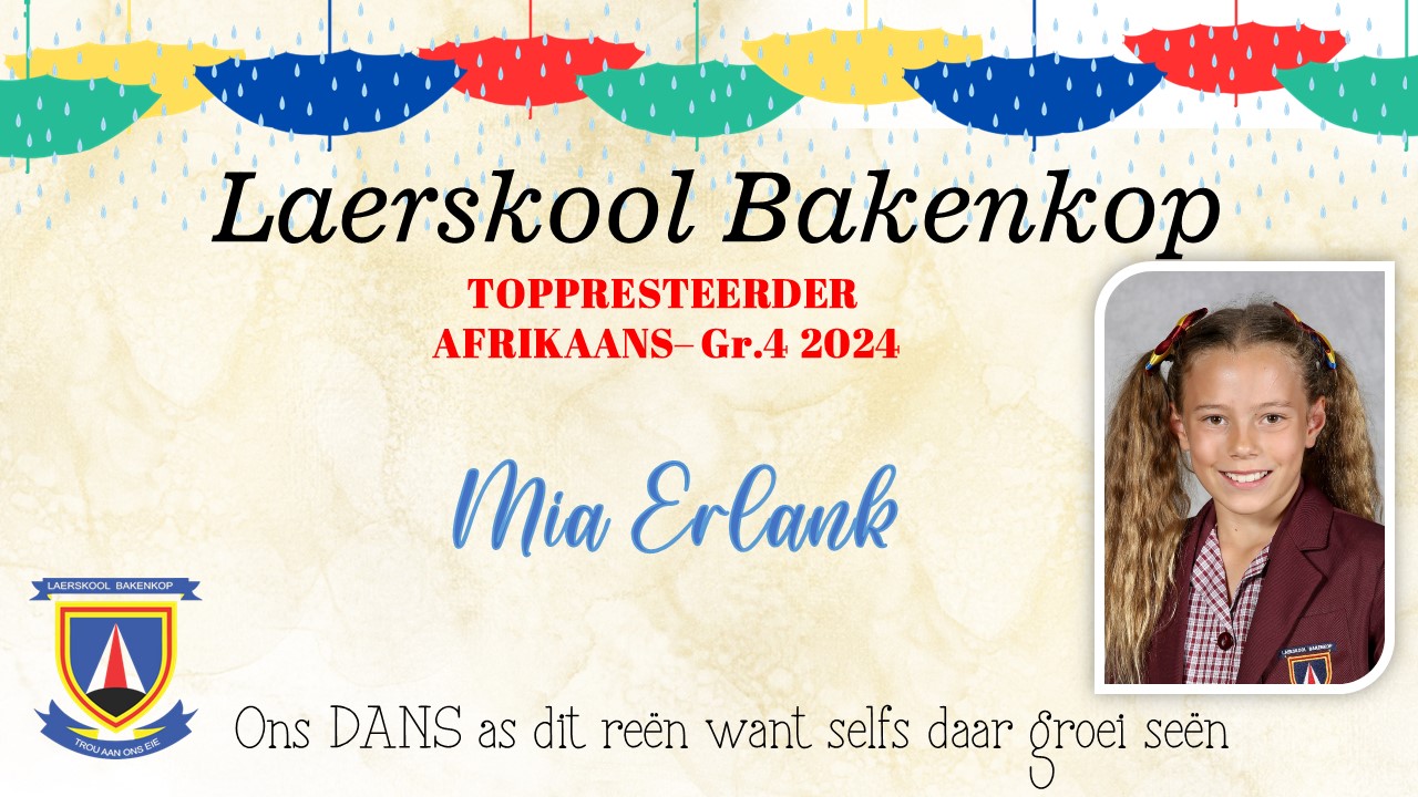 Baie geluk aan die Gr. 4 leerders wat op Akademiesegebied 'n sertifikaat en/of trofee ontvang het vir jou harde werk tydens ons Akademiese prysuitdelingsaand in 2024. Hieronder is ons uitsonderlike presteerders wat trofees ontvang het vir Akademie. Die toppresteerders vir sport en kultuur is onder die afsonderlike afdelings.