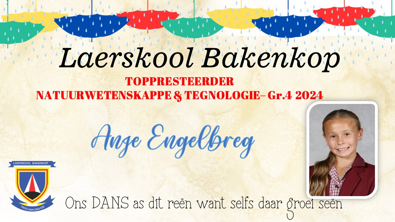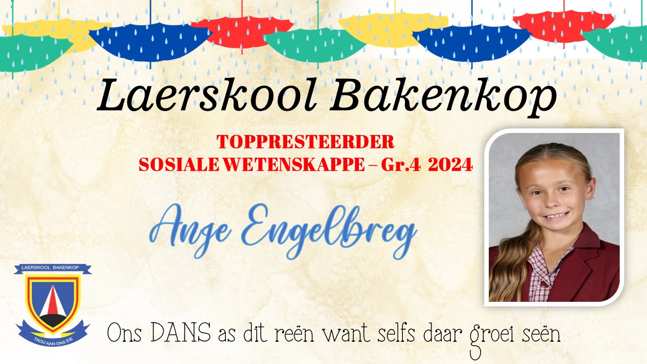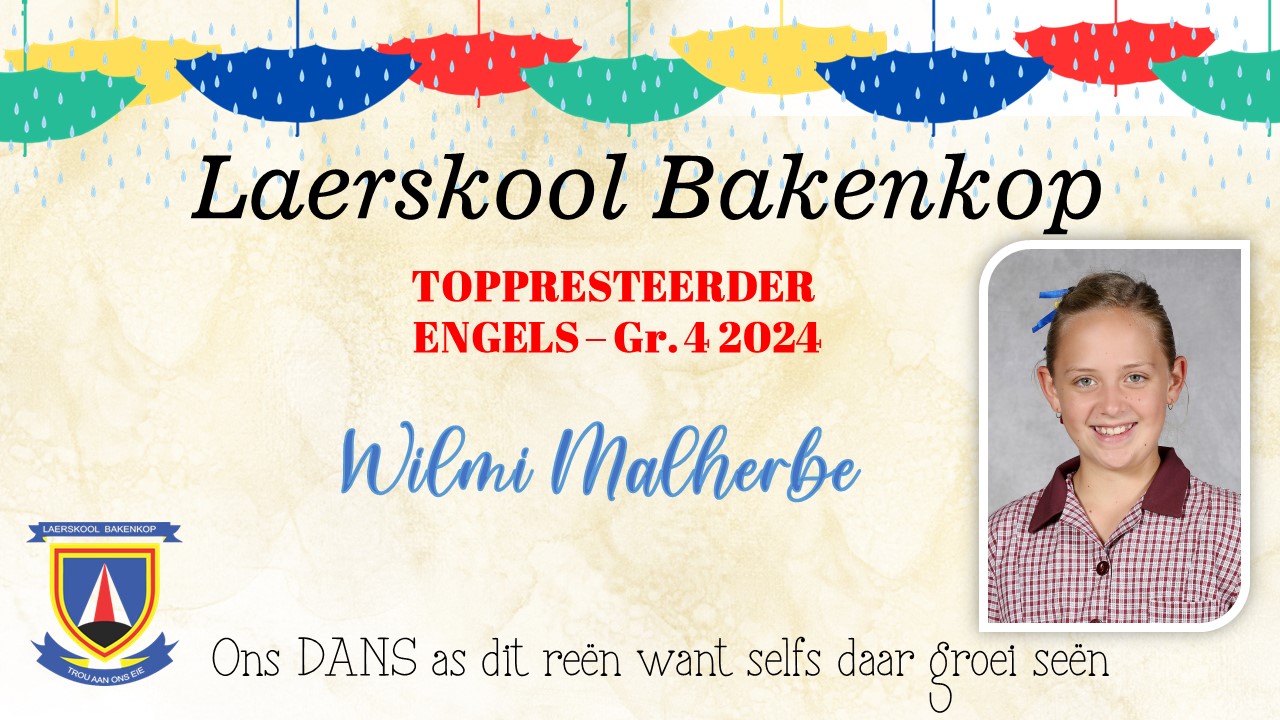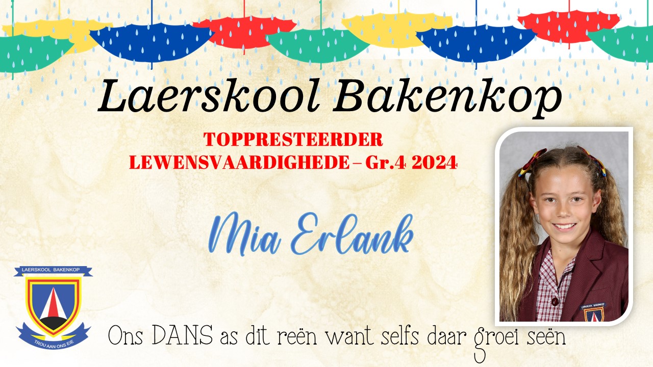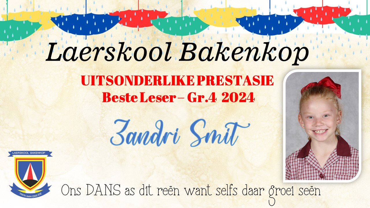 Baie geluk aan die Gr. 4 leerders wat op Akademiesegebied 'n sertifikaat en/of trofee ontvang het vir jou harde werk tydens ons Akademiese prysuitdelingsaand in 2024. Hieronder is ons uitsonderlike presteerders wat trofees ontvang het vir Akademie. Die toppresteerders vir sport en kultuur is onder die afsonderlike afdelings.